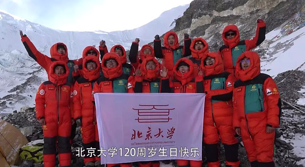 5月15日上午10时23分,北京大学登山队12名队员从珠穆朗玛峰北坡登顶海拔8844米的世界第一高峰。他们在高峰展现国旗和北大校旗,并喊出“团结起来、振兴中华”“北大精力、永在巅峰”,向120周年校庆献礼。