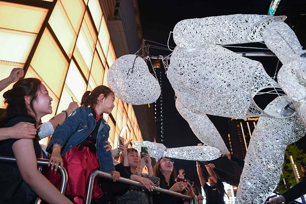 5月15日,高达4.5米的“巨型发光人偶”在扮演现场与一名小观众互动。当日,来自德国的Dundu露脸沈阳,其操作团队扮演时集视听、光效、舞蹈和人偶工艺于一身,精彩的发光人偶扮演招引许多市民前来观看并参加互动。