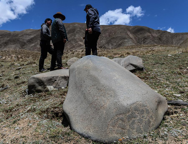 调查人员在检查称多县称文镇白龙村布日壁画点的遗址(5月14日摄)。日前,青海省玉树藏族自治州称多县文联工作人员在县域内不同地址新发现壁画数百幅。这些不同内容的壁画留存在山坡台地边的岩石之上,画面中依稀可见有鹿、牦牛等动物形象以及人物和符号。这些壁画时间跨度较大,一些可追溯至距今两千年左右,是我国通天河流域先民遗留下来的宝贵文明遗址。