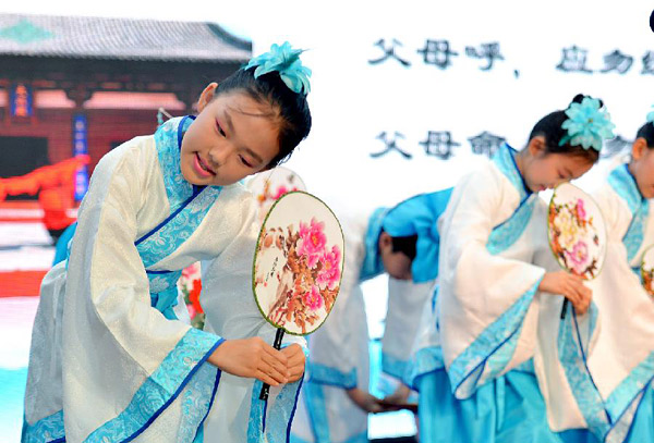5月15日,在河北省石家庄市桥西区举办的家风文明节上,身穿我国传统服装的小学生齐诵“家风家训”。当日是世界家庭日,桥西区举办家风文明节,经过赞誉“最美家庭”、吟诵家风家训、民间传统文明展演等方式,倡议文明调和的家庭气氛。