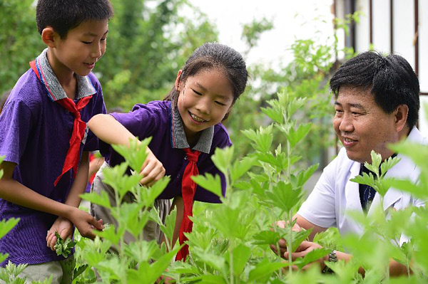 5月15日,在河北沧州一中药栽培基地,一名中医在辅导小学生知道中药材艾草。当日,河北省沧州市运河区向阳小学举办“采中药制香囊”感知中医文明课外活动,安排学生走进当地中药栽培加工基地,约请中医辅导学生现场知道、收集中药,制造传统中药香囊。