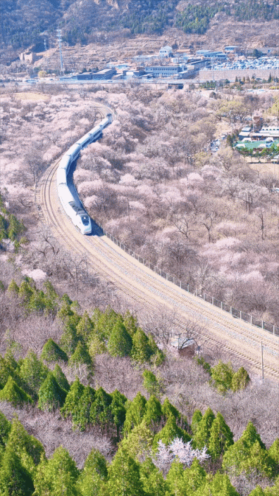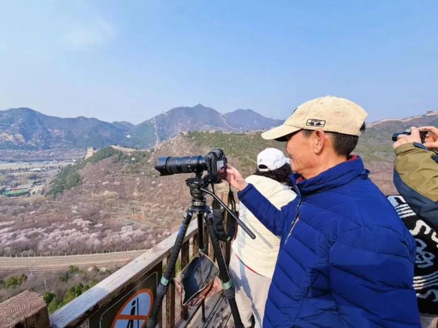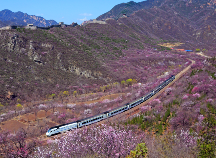散步花海栈道,原木步道平坦舒展,顺着山势慢慢延伸,两边山桃、杏花团团簇簇。抬眼望去,居庸关长城如巨龙占据山脊,与绚丽花海交相辉映,白色郊区列车慢慢驶过,穿行于粉色花廊之间,勾勒出春日限制的诗意画面。