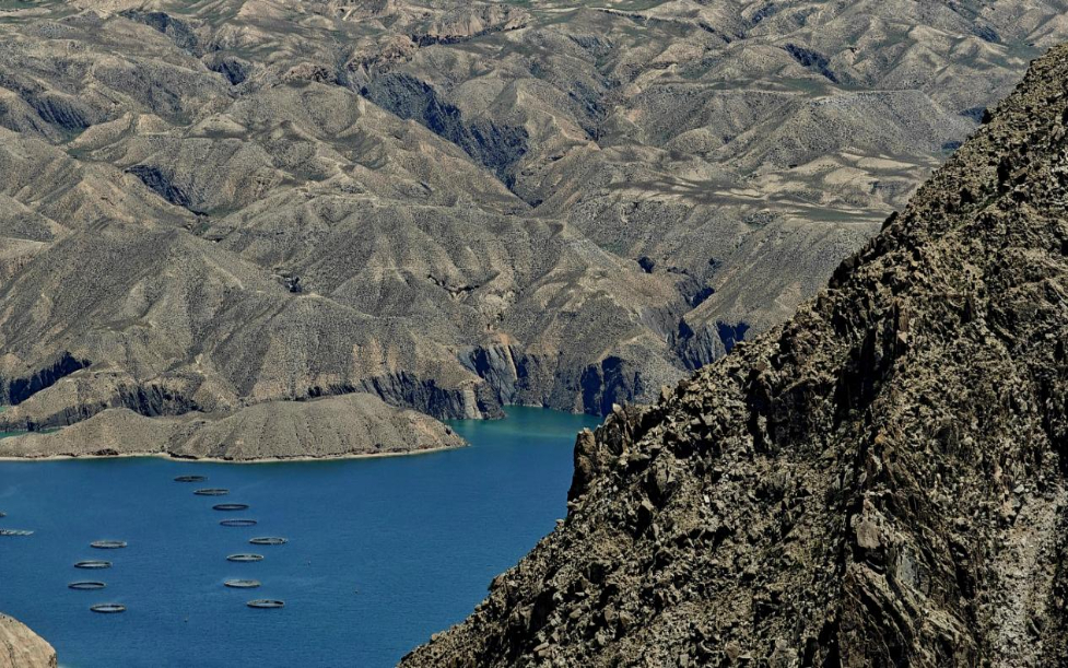 将视角从湖面升到高空,龙羊峡水库平湖区的水面上,数个大大的圆圈规整排开,这些都是虹鳟鱼的饲养网箱。疏密有致的网箱内,一条条肥硕的虹鳟鱼翻腾跳动。